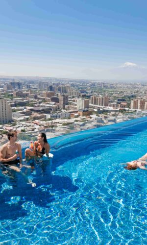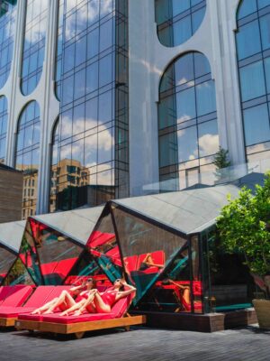 Seven Visions Resort & Places, The Dvin is a luxury hotel that has everything for your relaxation: spacious rooms in a sophisticated Art Deco style, a unique aerial theater without a stage One&Only, a nightclub with a retractable roof The Stage, a panoramic outdoor pool The Pool, a gastro bar Fragrance, a restaurant of modern Armenian cuisine with elements of fusion Hayrik, a banquet hall Dvin Music Hall, as well as a conference hall, a crossfit station and a tennis court with a professional surface. 11 meeting rooms, a gym and a Wellness & Spa center with baths, saunas, and a swimming pool will open soon.